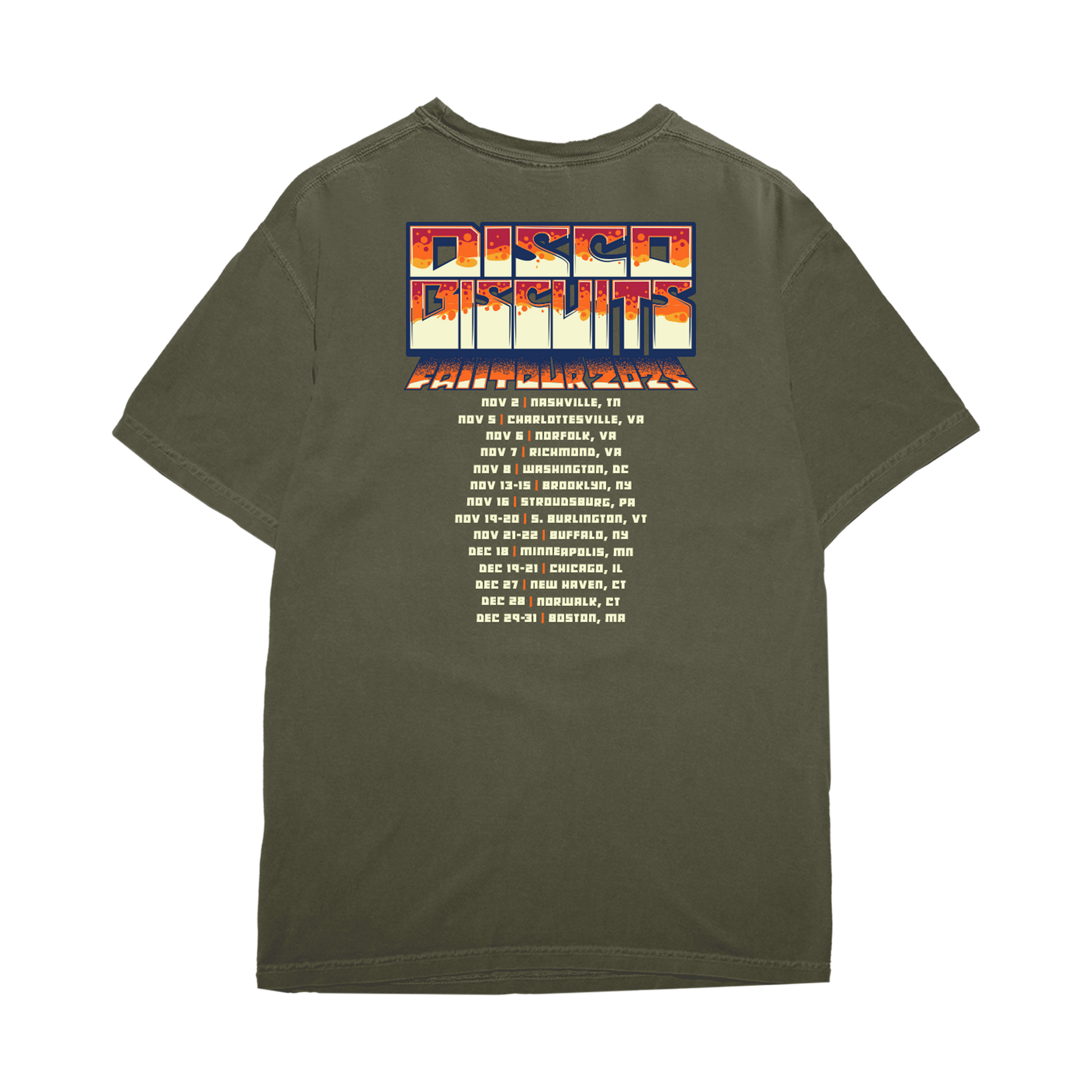 "Fall 2025 Tour" design printed on the front with tour dates on the back of a green 100% cotton t-shirt.